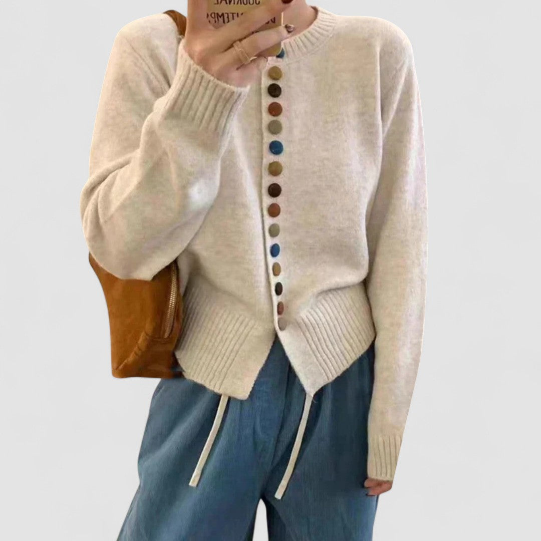 O Cardigã Celestine foi criado para mulheres que apreciam a combinação perfeita entre estilo clássico e conforto aconchegante. Confeccionado em malha macia e pesada, a sua fileira divertida de botões coloridos acrescenta um toque de alegria, enquanto a silhueta clássica garante versatilidade infinita. Seja para sobrepor numa caminhada fresca de outono ou para uma noite descontraída em casa, este cardigã torna-se rapidamente uma peça indispensável no seu guarda-roupa.