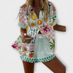 Sol ao alto, estilo que fascina: este é o conjunto curto Maevin com estampa de frutas.