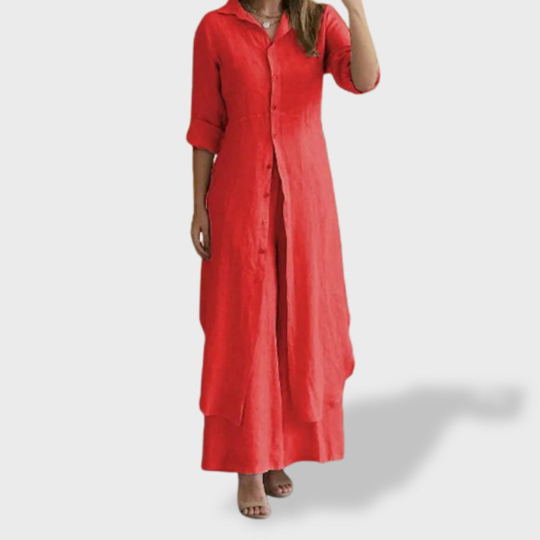 O Norellia™ é o conjunto curto ideal para quem procura frescura com classe nos dias mais quentes. Feito num linho suave e respirável, promete um toque leve e fluido que abraça o teu movimento com delicadeza. A camisa descontraída e os calções curtos criam uma silhueta contemporânea e feminina — perfeita para escapadelas tranquilas, passeios ou um dia descontraído com charme.