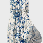 Este maravilhoso vestido longo em fundo branco com padrão floral azul exala frescor e elegância. O seu design leve proporciona um toque romântico, enquanto o cinto na cintura realça a silhueta de forma natural e feminina.