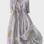Este encantador vestido longo em tom lilás suave é a escolha ideal para um visual fresco e primaveril. Seu design discreto com margaridas brancas e amarelas transmite uma sensação leve e alegre, enquanto o cinto na cintura proporciona um caimento perfeito.