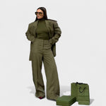 Este conjunto redefine o conceito de elegância contemporânea. Com um blazer de corte estruturado e calças largas de cintura subida, oferece uma silhueta marcante e sofisticada, perfeita para quem quer afirmar a sua presença com confiança.