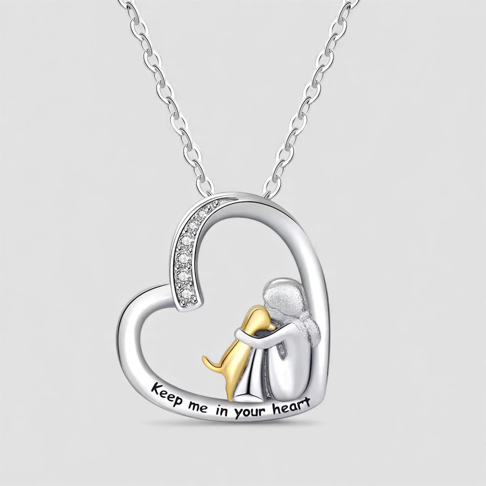 Este colar é uma forma delicada de manter o amor sempre por perto. O design mostra uma mulher e o seu cão num abraço carinhoso e afetuoso — simples, suave e cheio de significado. É leve, fácil de combinar com qualquer roupa e uma bela lembrança do laço que dura para sempre.