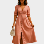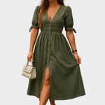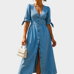 O Vestido Maxi de Denim com Botões é a escolha perfeita para aparências elegantes, mas também confortáveis. Apresenta um decote em V, botões ao longo de todo o comprimento, mangas 3/4 com laço e elástico na cintura para realçar a silhueta. Combina facilmente com sapatilhas para um look casual ou com sandálias/ saltos para um estilo mais feminino.